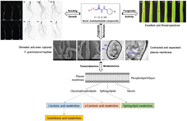 设计、合成了一类含吡啶杂原子结构的新型乙酰肼类化合物,其对常见农业病原真菌小麦赤霉病菌、玉米纹枯病菌、水稻稻瘟病菌、灰霉病菌、炭疽病菌、链格菌等表现出高效和广谱的杀菌活性。以商品化药剂多菌灵、戊唑醇、氟吡菌酰胺为阳性对照,化合物C4、C8、D8的杀菌活性最佳,如EC50=1.08 μg/mL (F. graminearum), 0.59 μg/mL (P. grisea)等。作用机制研究发现C4会影响细胞膜的正常功能,且对作物生长几乎无影响。该类结构合成路线简洁、后处理方便且合成成本低,其高效、广谱的杀菌活性和独特的作用机制对缓解日趋严峻的病原菌抗药性问题具有重要的作用,可测试其田间药效,结合环境毒理,以评估该类结构的实际应用价值和潜在的商业前景。