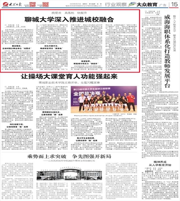 【编者按】9月23日,《大众日报》第15版“行业观察 大众教育”版面以《yl6776永利集团官网深入推进城校融合》为题,报道了我校2021年以来,遵照“学党史、悟思想、办实事、开新局”的总要求,深入推进城校融合,强化校地校企产学研协同创新,以实际行动回应区域经济社会重大战略需求,城校融合发展共同体建设成效明显的典型经验。