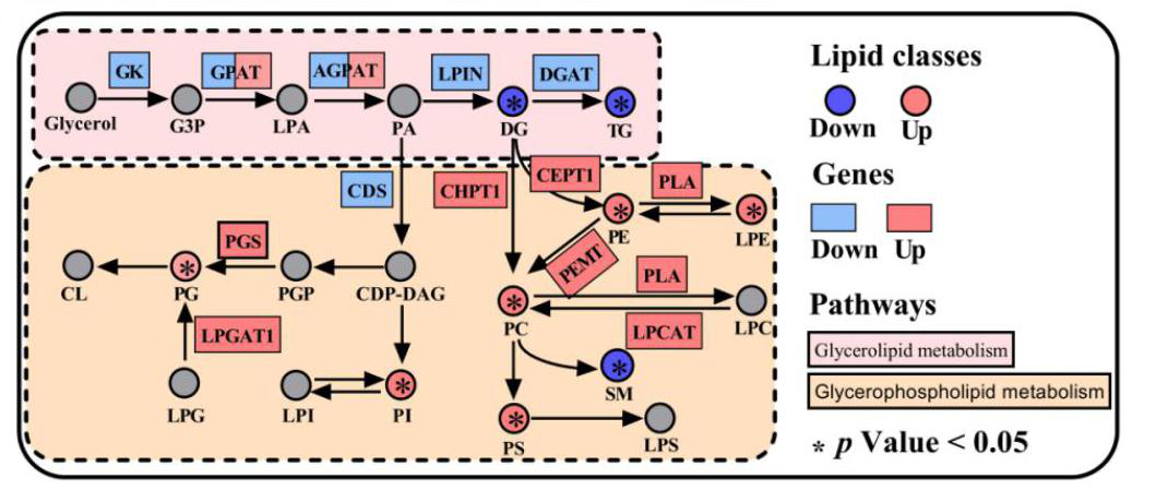 本研究利用团队前期建立的基于液相色谱-质谱法的脂质组学(Li et al,2021, Journal of Food Science )以及联合转录组学技术,发现驴肉IMF富含磷脂(数量和含量)和多不饱和脂肪酸(PUFA),且PUFA优先分布在甘油三酯的sn-1位置以及磷脂酰胆碱和磷脂酰乙醇胺的sn-2位置;这可能由于38个高含量脂质分子(37个甘油磷脂和1个鞘磷脂)以及磷脂合成相关基因在肌肉中高表达所致;甘油脂和甘油磷脂代谢被认为是调控IMF的关键途径。本研究成果为清晰认识IMF及其精准调控提供理论依据,对提高驴肉中IMF含量,改善肉的食用品质和价值具有重要实际意义。