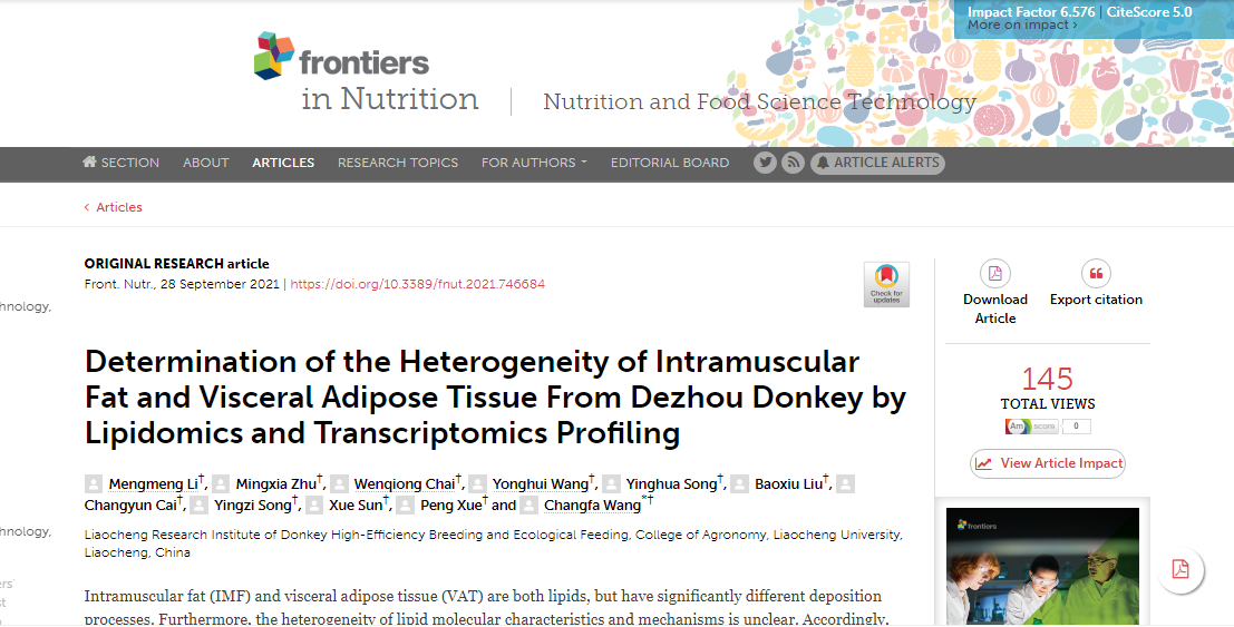 近日,我校聊城毛驴高效繁育与生态饲养研究院王长法教授团队在国际营养研究领域杂志《Frontiers in Nutrition》(营养前沿)(IF2020=6.576,JCR分区Q1)在线发表了研究论文,该论文的题目为《Determination of the heterogeneity of intramuscular fat and visceral adipose tissue from Dezhou donkey by lipidomics and transcriptomics profiling》(基于脂质组和转录组对驴肌内脂肪和脂肪组织异质性的研究)。该研究在脂质分子及其代谢特征上解析了驴肉脂质组成(“脂质谱”),为清晰认识驴肉营养价值和提高肌内沉脂提供了新的视角。
