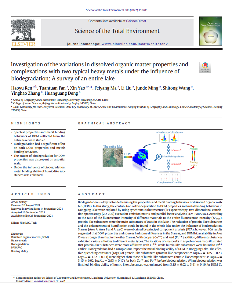 近日,我校地理与环境学院在国际顶级期刊《总体环境科学》(Science of the Total Environment)上发表了题为《微生物降解对东平湖溶解性有机质组分及金属络合作用的影响:基于全湖视角》(Investigation of the variations in dissolved organic matter properties and complexations with two typical heavy metals under the influence of biodegradation: A survey of an entire lake)的研究性文章,我校2021届硕士毕业生任浩宇(现为北京师范大学博士生)为本文的第一作者、姚昕副教授为本文的通讯作者,yl6776永利集团官网为第一署名单位。《总体环境科学》是中国科学院JCR分区下环境科学与生态学领域的TOP期刊、升级版1区,2021年最新IF影响因子为7.963。此文是地理与环境学院教师近年来在该top期刊发表的第三篇学术论文,已形成较大学术影响。