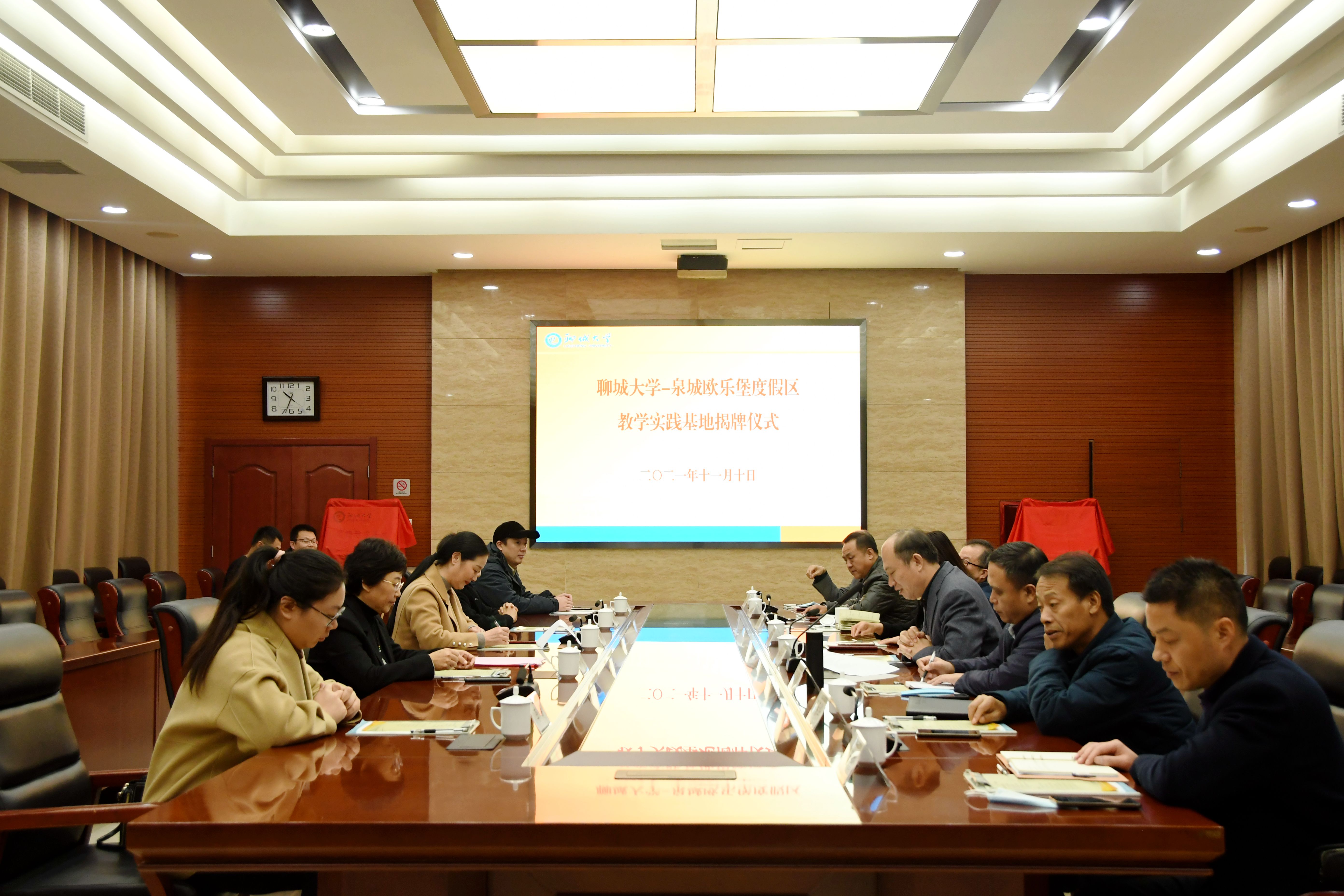 11月10日,yl6776永利集团官网—泉城欧乐堡度假区教学实践基地揭牌仪式于第四会议室举行。坤河旅游开发有限公司常务副总经理刘妍,党委常委、副校长肖海荣出席揭牌仪式。党委书记关延平在仪式前与刘妍进行了座谈交流。