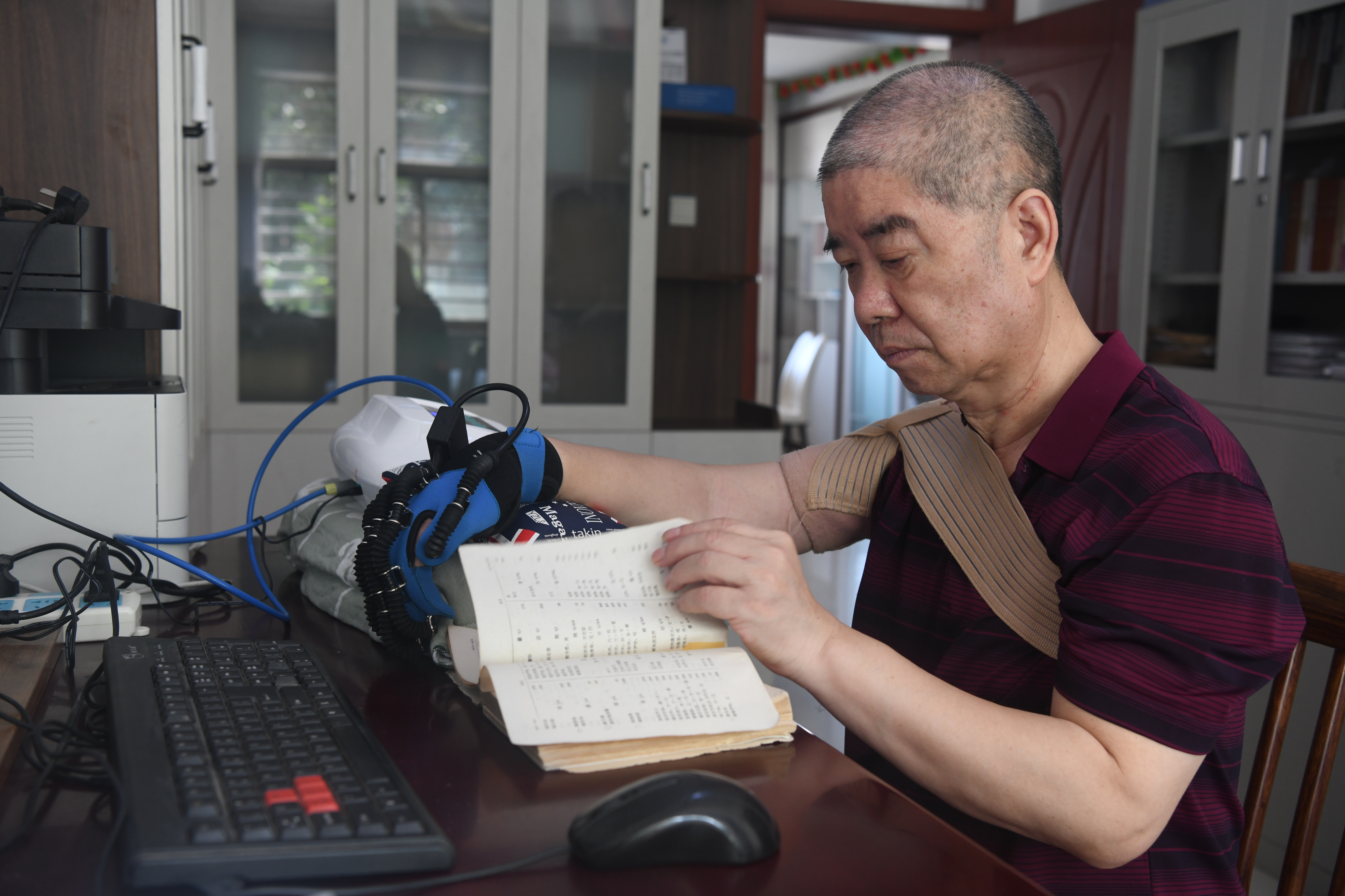如今,赵老师的身体状况大大好转,除了锻炼康复,他还是按照生病之前的工作时间表,每天都坚持看书、改文章。唯一不同的是,如今的他右手带着复健设备,用左手翻书点击键盘。