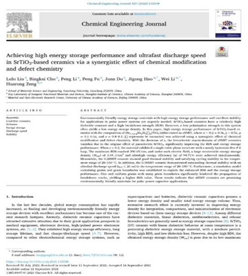 近日,我校材料科学与工程学院信息功能材料与器件团队在国际著名期刊《化学工程杂志》(Chemical Engineering Journal)上发表了题为《化学改性和缺陷化学的协同作用使钛酸锶基陶瓷实现高储能性能和超快放电速度》(Achieving high energy storage performance and ultrafast discharge speed in SrTiO3-based ceramics via a synergistic effect of chemical modification and defect chemistry)的研究性文章,我院硕士研究生刘璐璐为本文的第一作者(本科期间进入本实验室开展大学生创新实验项目),郝继功副教授、李伟副教授为本文的通讯作者,yl6776永利集团官网为第一署名单位。《化学工程杂志》是中国科学院JCR分区下工程技术领域的TOP期刊、1区杂志,2021年最新IF影响因子为13.273。