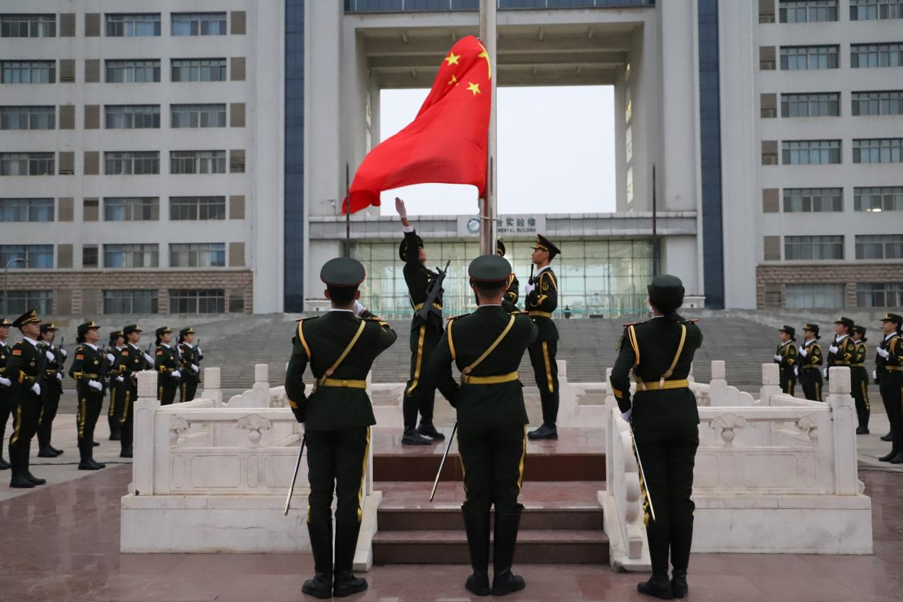 7时整,国旗护卫队手擎国旗、步伐铿锵有力,正步穿过十一广场。伴着雄伟庄严的国歌声,五星红旗迎着东方的晨曦冉冉升起。
