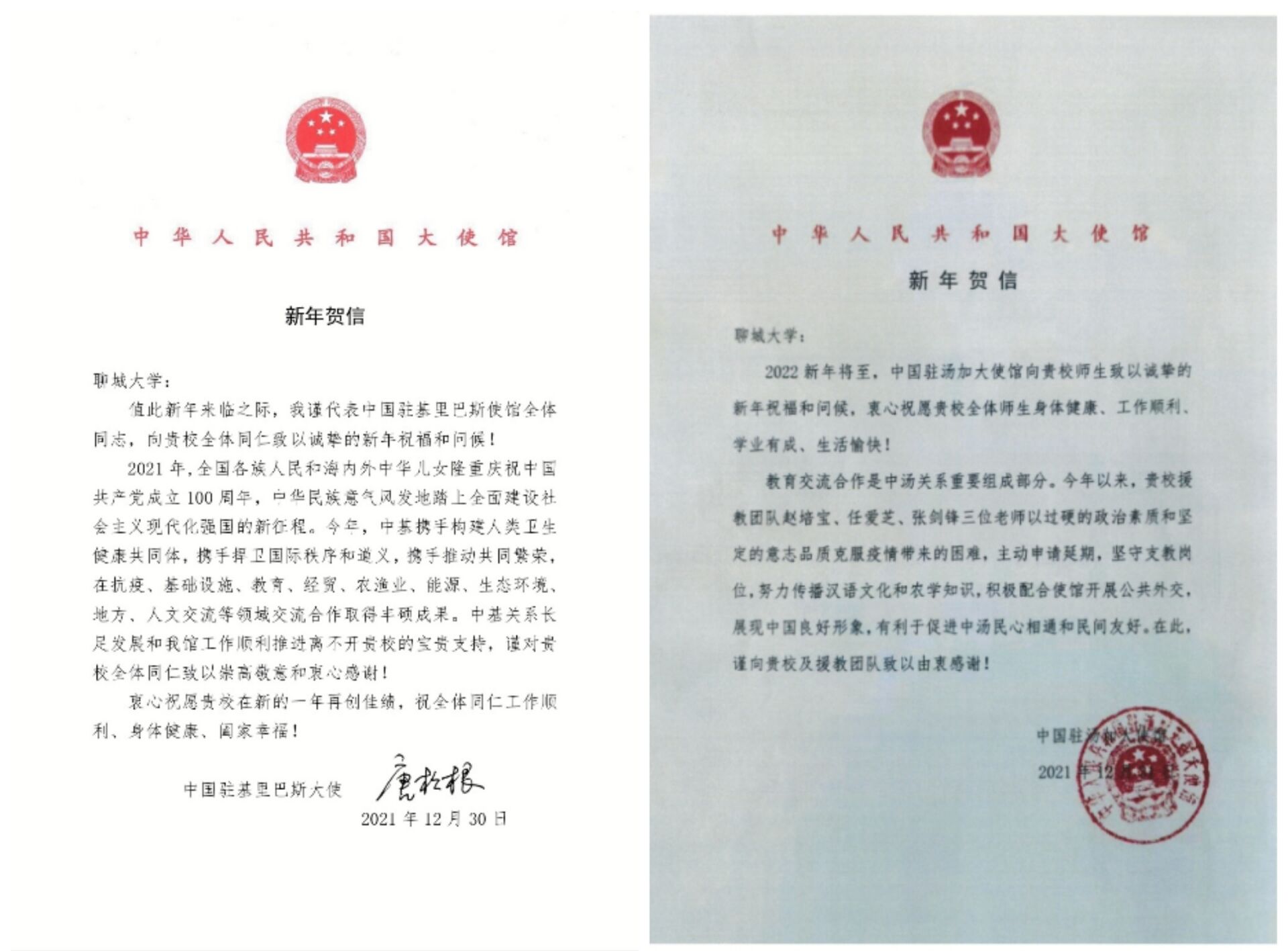 近日,我校收到中国驻基里巴斯大使馆、中国驻汤加大使馆发来的新年贺信,感谢我校在中基、中汤关系发展及援教等工作顺利推进中发挥的积极作用,并向全校师生员工致以新年祝福和问候。