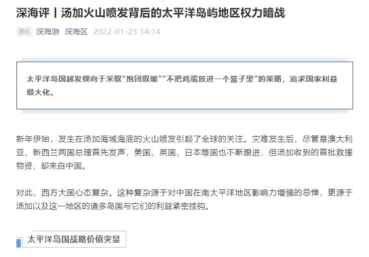 文章从汤加收到的首批援助物资来自中国开始,围绕“太平洋岛国战略价值突显”“美澳等国意欲加强控制”“对话合作助力岛国外交”等三个方面,深度剖析了太平洋岛国目前的国际地位、国际形势,美、澳、日等国在岛国的经济援助和利益博弈,介绍了太平洋岛国在多年与西方合作失望后,“不把鸡蛋放进一个篮子里”,“期待搭上中国经济发展的快车,实现经济跨越式发展的”的诉求。