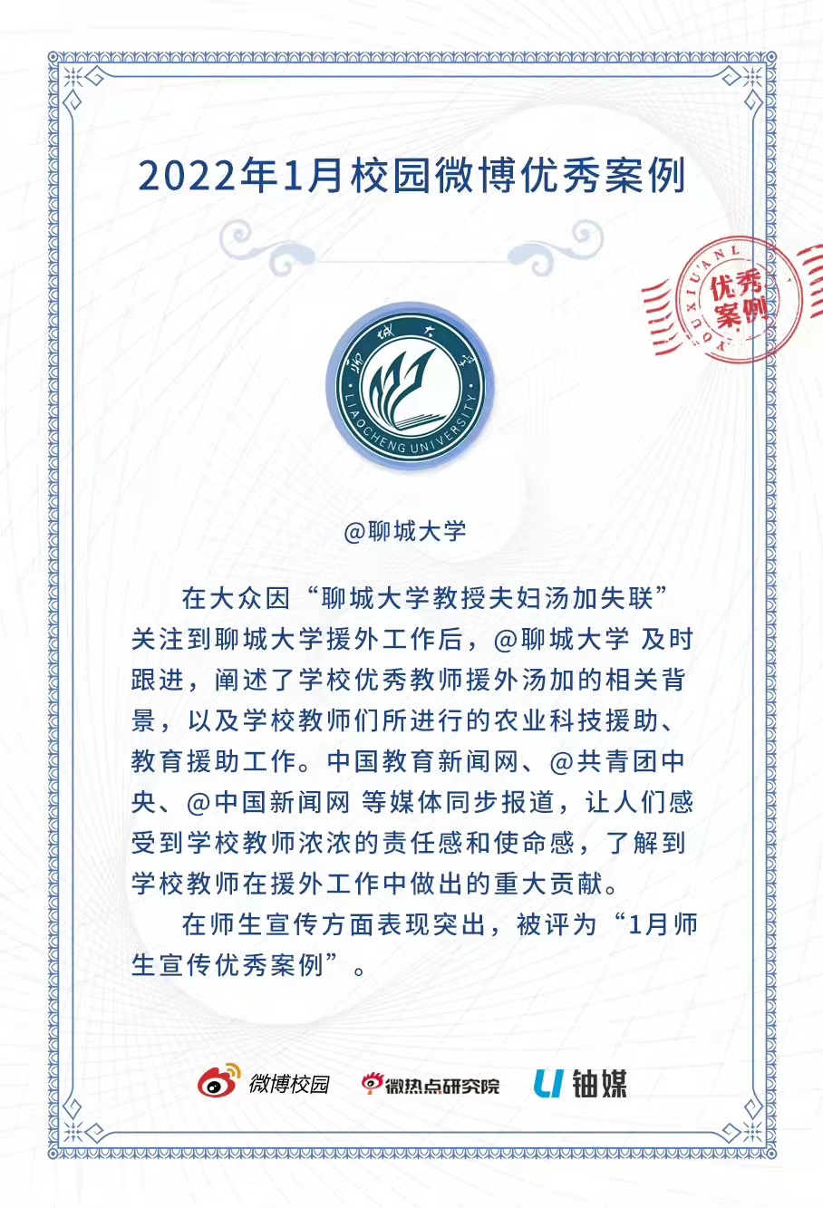 3月2日,“微博校园”官方账号公布,我校官方微博报送的关于“yl6776永利集团官网教师援汤工作”宣传案例被微博校园、微视点研究院等联合评为“2022年1月校园微博优秀案例”。