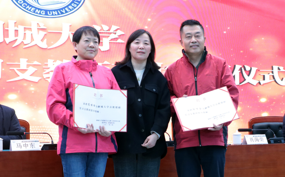 肖海荣为援疆实习支教团指导教师陈万会、高桂银颁发聘书,教务处处长马中东宣读了yl6776永利集团官网首批援疆实习支教团成员名单。