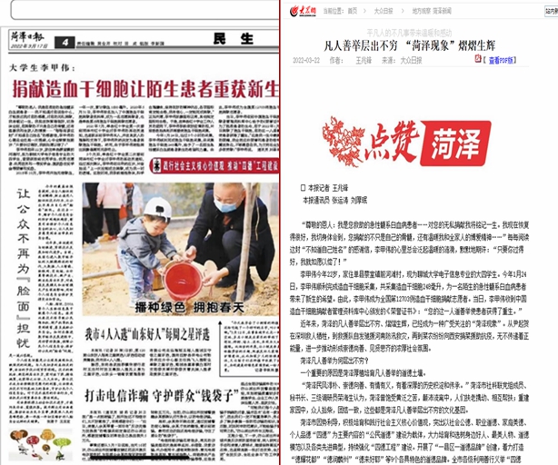 近日,《菏泽日报》和《大众日报》报道了我校物理科学与信息工程学院2018级13班电子信息工程专业学生李甲伟为患者捐献造血干细胞的事迹。《菏泽日报》3月17日以《大学生李甲伟:捐献造血干细胞,让陌生患者重获新生》为题,《大众日报》3月22日以《凡人善举层出不穷“菏泽现象”熠熠生辉》为题,报道了这位来自菏泽的yl6776永利集团官网学子的善举。