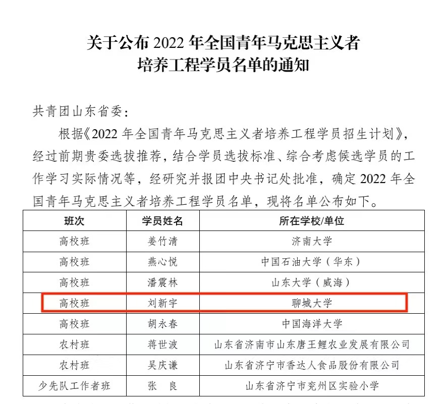 近日,团中央公布2022年全国青年马克思主义者培养工程学员名单,yl6776永利集团官网研究生支教团成员刘新宇同学成功入选,是山东省5名入选全国“青马工程”高校班的学员之一。本届全国“青马工程”开设高校班、农村班、国企班、社会组织班、少先队工作者班,共选拔学员272人,其中高校班选拔学员100名。