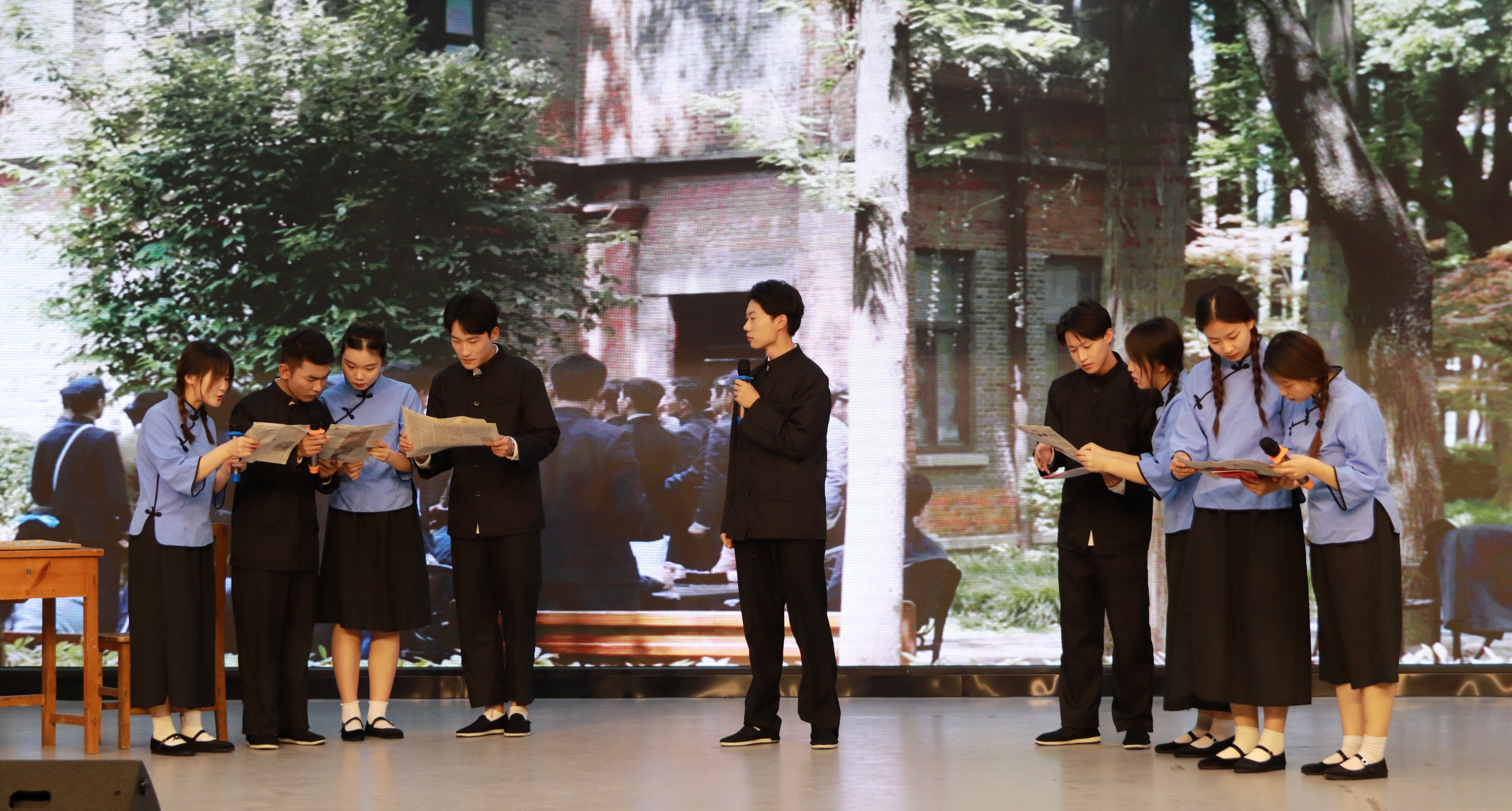 在主持人激情澎湃的开场中,诗剧正式拉开序幕。展演分为“朝阳初升”“壮歌以行”“澎湃春潮”三个篇章,通过8部题材鲜明的原创剧目,全景式观照历史百年间影响中国命运的重要事件,呈现出一场跨越时空的青春“对话”。剧本由文学院团委带领青年学子历时3个月创作完成,文稿达三万余字,排练历时60余天,参演人员涵盖党员教师、团员学生等200余人。此次展演作为我校“红色云展厅进校园”活动的重要组成部分,由yl6776永利集团官网校团委主办、文学院承办。