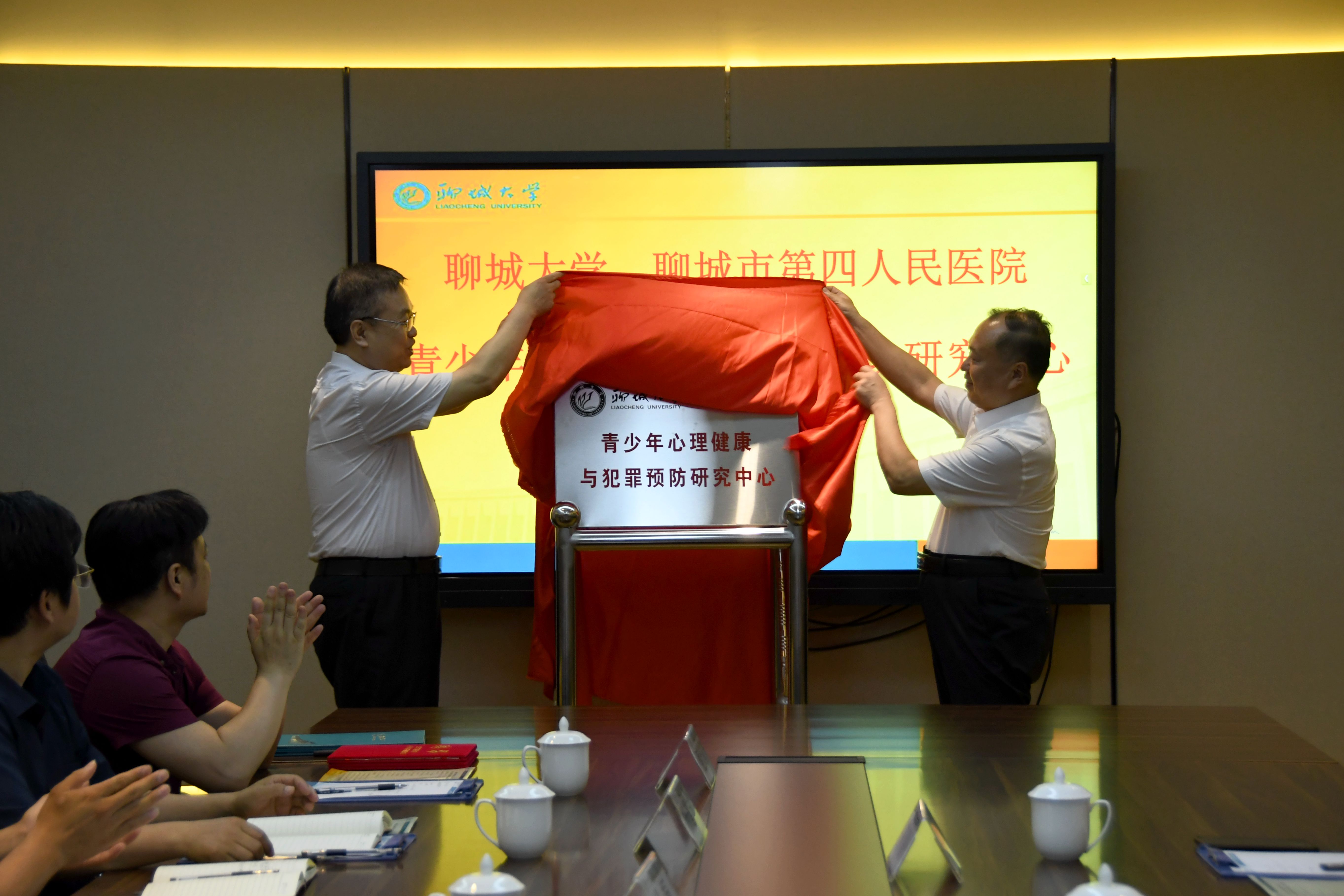 6月2日,yl6776永利集团官网—聊城市第四人民医院“青少年心理健康与犯罪预防研究中心”揭牌仪式在第一会议室举行。聊城市第四人民医院党委书记武建胤,党委副书记、院长江景华,我校党委常委、副校长赵长林、融合发展处、法学院负责同志参加揭牌仪式。