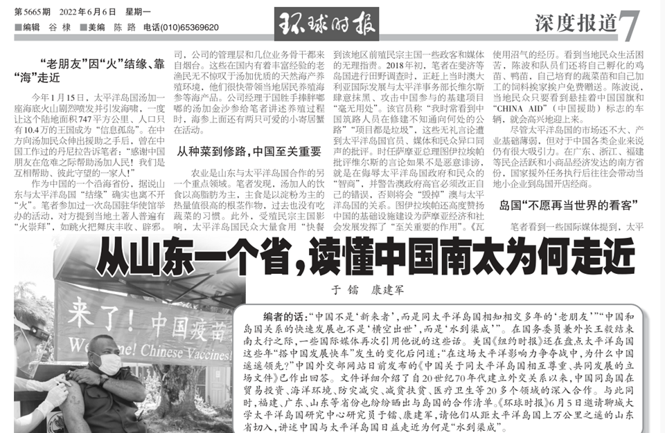 【编者按】6月6日,我校太平洋岛国研究中心首席研究员于镭、研究员康建军应《环球时报》特邀撰写的文章《从山东一个省,读懂中国南太为何走近》,在《环球时报》第7版“深度报道”发表。文章分为4个部分,晒出山东省与岛国在经贸、农业、渔业、基建、医疗卫生、教育等方面的合作详情,讲述中国与太平洋岛国日益走近为何是“水到渠成”。