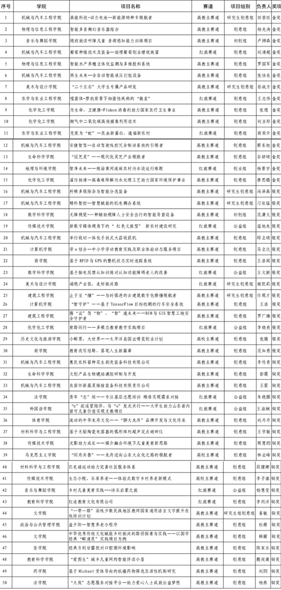 自大赛启动以来,全校共有1000余项报名参赛,师生参与人数达万人。历经院赛和校赛初评,最终有50组参赛团队进入校赛决赛,决赛选聘了3名校外“互联网+”国赛、省赛专家担任评委。经现场路演展示、专家问辩和评分等环节的激烈角逐,机械与汽车工程学院“森能科技-动力电池--新能源特种车领航者”等15个项目斩获金奖,另有数学科学学院“无障视觉-一种辅助视障人士安全出行的智能导盲设备”等15个项目和马克思主义学院“‘同舟共鲁’——龙舟迈向山东大众化之路的领航者”等20个项目分获银奖和铜奖。