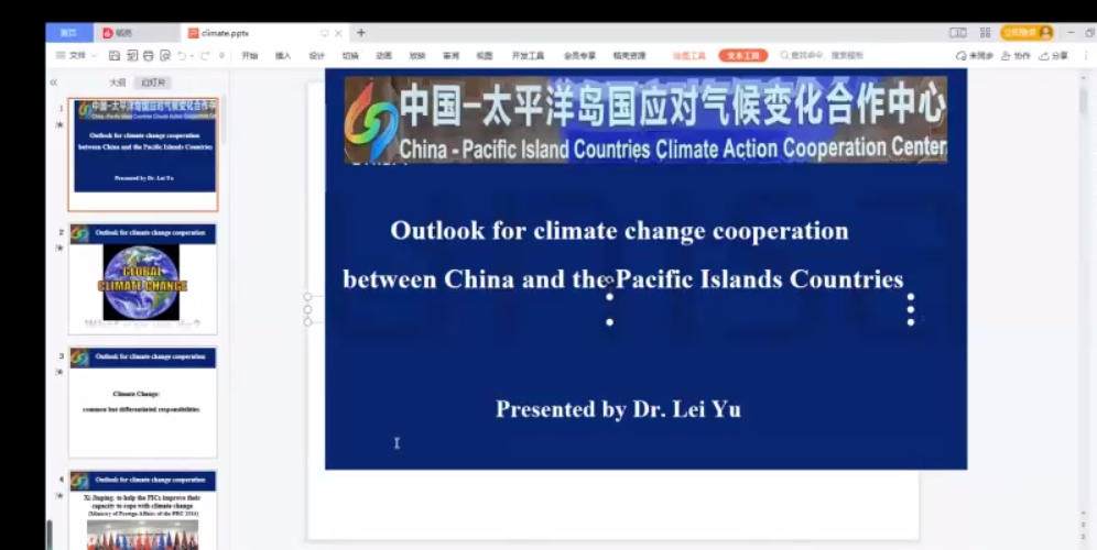 我校太平洋岛国研究中心首席专家于镭教授作为培训专家参与授课。于镭教授从多年从事太平洋岛国研究并多次到太平洋岛国参加中-太合作交流的亲身感受出发,向参加培训的学员介绍了中国与太平洋岛国在应对气候变化领域的合作、中国自身在应对气候变化方面所采取的行动与成效,并对中国-太平洋岛国应对气候变化合作方式谈了自己的见解,赢得了广大学员的共鸣。