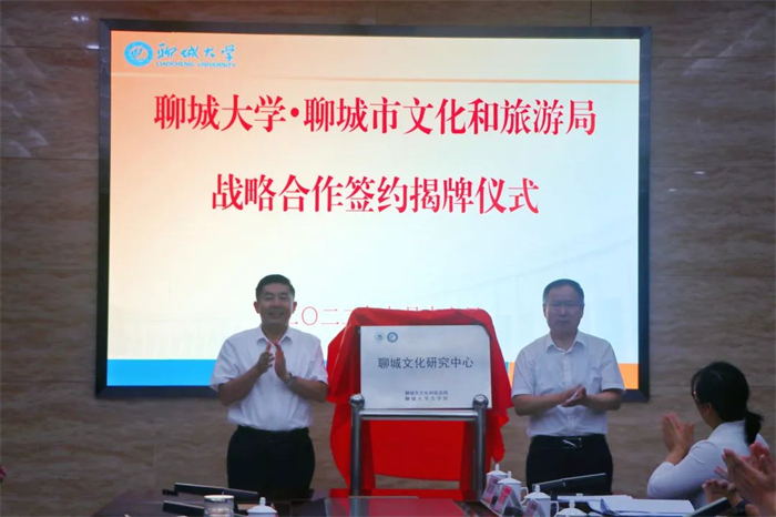 胡海泉、赵长林与柳庆发为“聊城文化研究中心”“运河文化研究中心”揭牌;文学院院长卢军、运河学研究院执行院长丁延峰与聊城市文化和旅游局党组书记、局长周江涛签署战略合作协议。