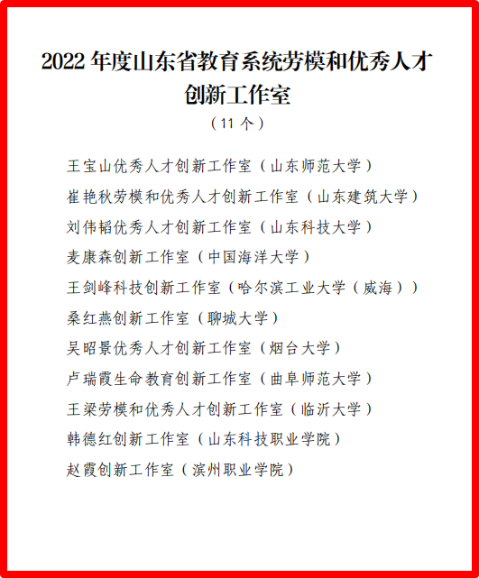 近日,山东省教育工会委员会公布2022年度省教育系统劳模和优秀人才创新工作室名单,全省共11个工作室入选,我校“桑红燕创新工作室”荣列其中。