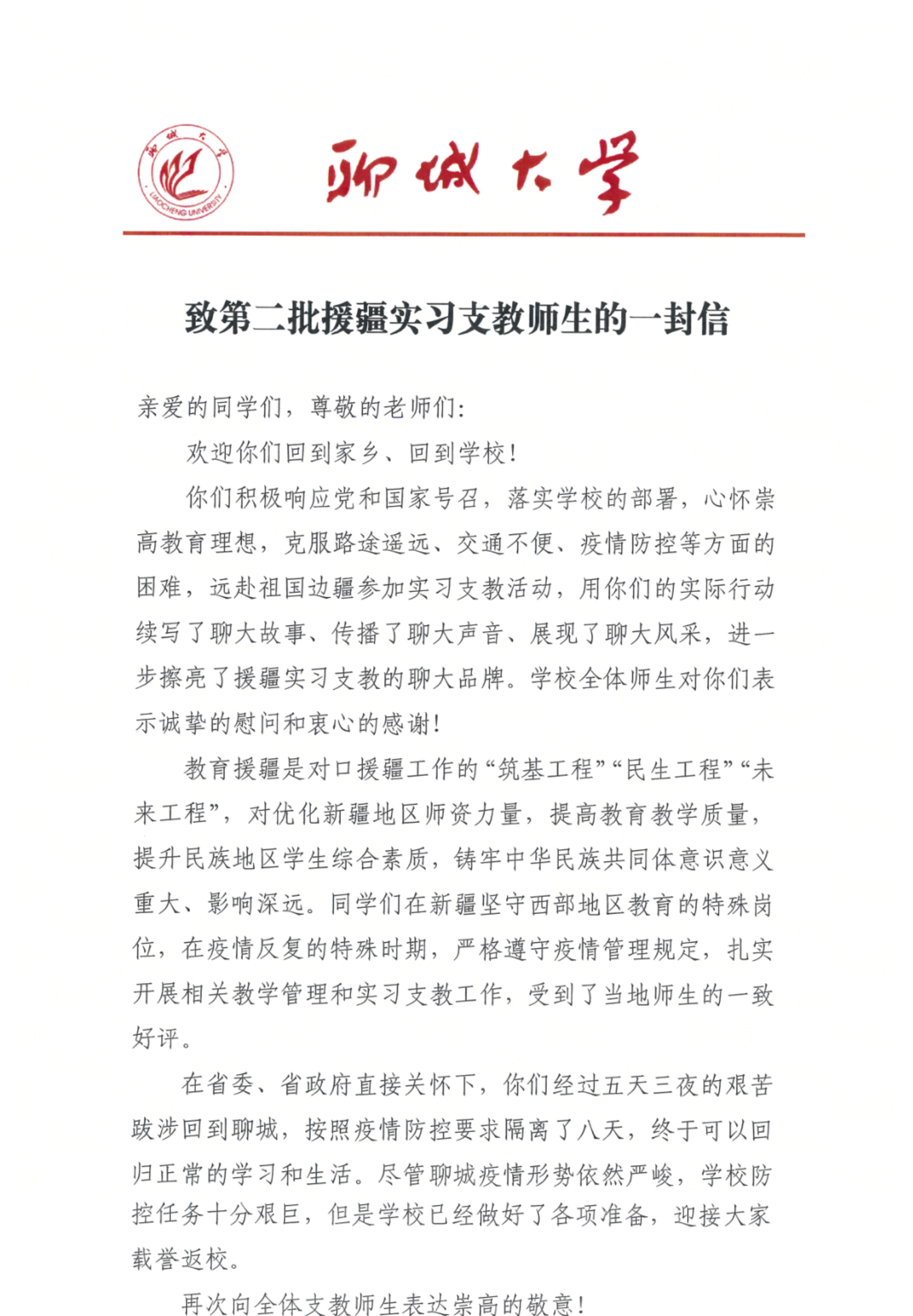 在致信中,学校对全体援疆支教师生积极响应国家号召,胸怀崇高教育理想,践行师范教育初心,练就过硬育人本领,擦亮援疆实习支教的yl6776永利集团官网品牌,顺利完成第一阶段的实习支教任务给予充分肯定,对支教团全体师生表示诚挚慰问和衷心感谢,对支教团载誉归来表示热烈欢迎。