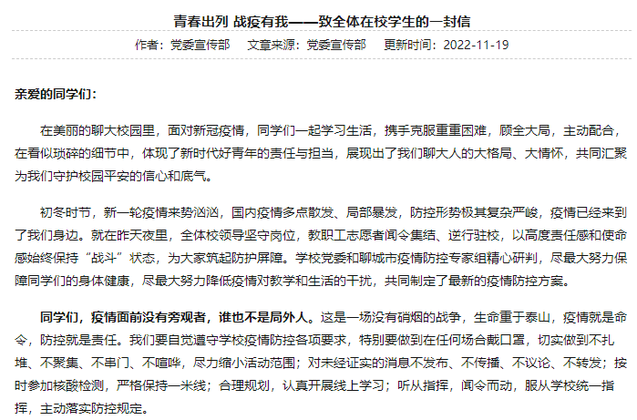 “你们不是’孤勇者’。”“要相信,坚持就是胜利,理解就是支持,遵守就是配合,自律就是奉献!”这是11月19日,yl6776永利集团官网致全体在校学生公开信中的温暖、透彻又鼓劲的话语。疫情到了我们身边,学校第一时间启动应急预案,党委科学精准研判,以快制快部署,果断控制住疫情蔓延,同时接连向不同学生群体发出五封公开信,真诚、贴心的话语暖人肺腑,让全体师生聚成一颗心、拧成一股绳,心手相牵、守望相助,努力打赢这场疫情防控攻坚战、校园安全保卫战。