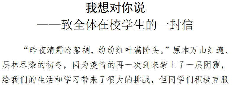 为了解除学生的担心和忧虑,从19日凌晨开始,学校相继发出致全体同学、致转运隔离同学、致在校同学、致解除隔离同学、致援疆支教同学的公开信,并积极组织学校媒体发布学校各类抗疫信息,有效营造了众志成城、抗疫护校的浓厚舆论氛围。