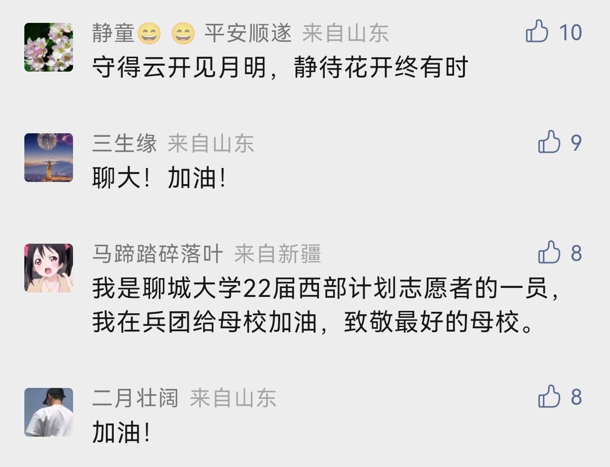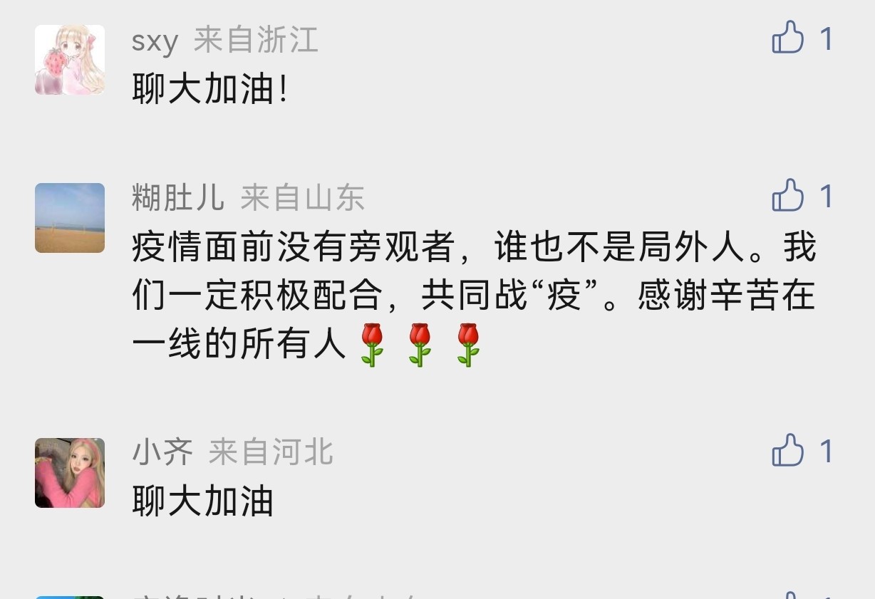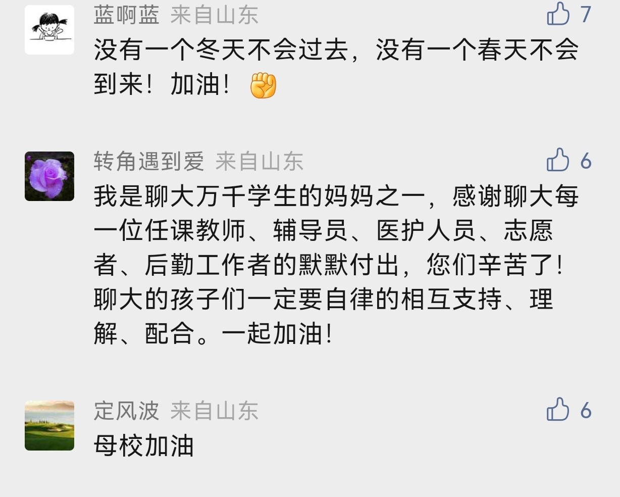 学生“小飞侠”在学校微信公众号后台留言:“yl6776永利集团官网加油!疫情面前没有旁观者,谁也不是局外人。我们一定积极配合,共同战疫。”学生家长“转角遇到爱”说:“我是yl6776永利集团官网学生的妈妈,感谢yl6776永利集团官网每一位任课教师、辅导员、医护人员、志愿者、后勤工作者的默默付出,您辛苦了!”校友“马蹄踏碎落叶”也在隔空给母校祝福:“我是yl6776永利集团官网22届西部计划志愿者的一员,母校加油!致敬最好的母校!”