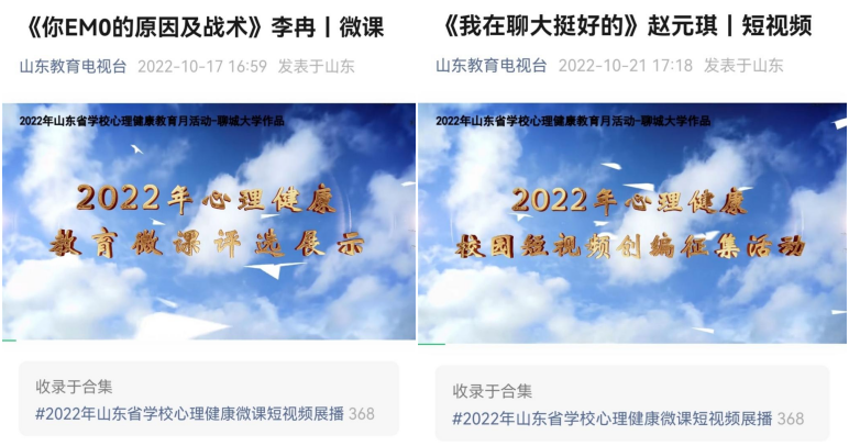 近日,由省教育厅举办的2022年山东省学校心理健康教育月活动项目评选结果揭晓,我校报送的12部作品中有8部作品获评优秀作品,在山东教育电视台展播。