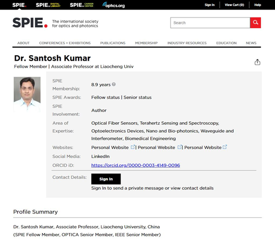 近日,国际光学工程学会(Society of Photo-Optical Instrumentation Engineers,SPIE)公布了2023年新入选的83位会士名单,其中共有8位来自中国高校及科研机构的科学家当选,我校物理科学与信息工程学院桑托斯·库玛(Santosh Kumar)副教授因其在光纤等离子体生物传感器临床应用方面的开创性贡献成功入选SPIE Fellow(国际光学工程学会会士)。