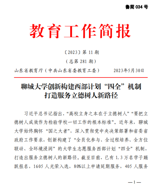 【编者按】5月30日,山东省教育厅(中共山东省委教育工委)教育工作简报以《yl6776永利集团官网创新构建西部计划“四全”机制打造服务立德树人新路径》为题,刊发我校积极构建“全员化参与、全过程培养、全方位联动、全环境浸润”的“四全”机制,扎实推进大学生志愿服务西部计划工作,打造特色育人品牌服务立德树人根本任务的经验做法。