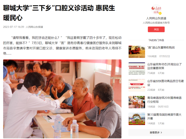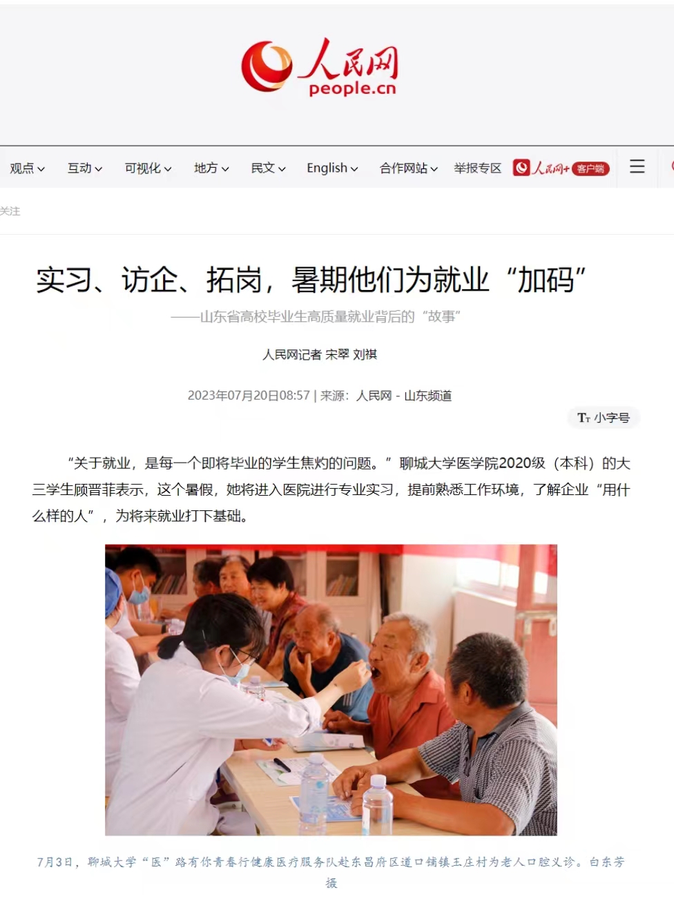 【编者按】近日,人民网山东频道首页焦点新闻、人民网头条号都推出重点报道,详细介绍了yl6776永利集团官网医学院“医”路有你青春行健康医疗服务队前往聊城市冠县辛集镇辛集村开展口腔义诊、健康宣讲志愿服务,以专业实习“刷履历”“攒经验”,通过志愿服务为毕业实习搭建平台,增加学生就业机会和工作经验。