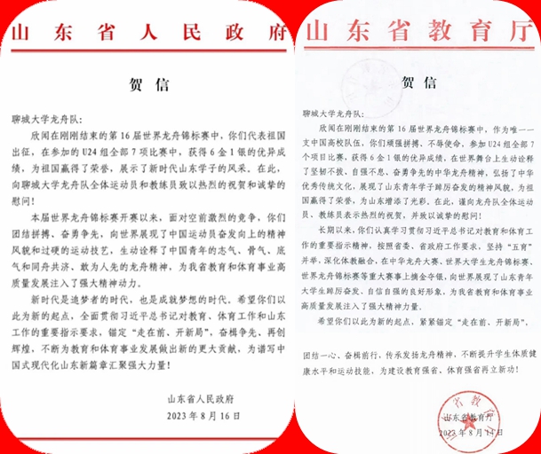 欣闻在刚刚结束的第16届世界龙舟锦标赛中,作为唯一一支中国高校队伍,你们顽强拼搏、不辱使命,参加U24组全部7个项目比赛,获得6金1银的优异成绩,在世界舞台上生动诠释了坚韧不拔、自强不息、奋勇争先的中华龙舟精神,弘扬了中华优秀传统文化,展现了山东青年学子踔厉奋发的精神风貌,为祖国赢得了荣誉,为山东增添了光彩。在此,谨向龙舟队全体运动员、教练员表示热烈的祝贺,并致以诚挚的慰问!