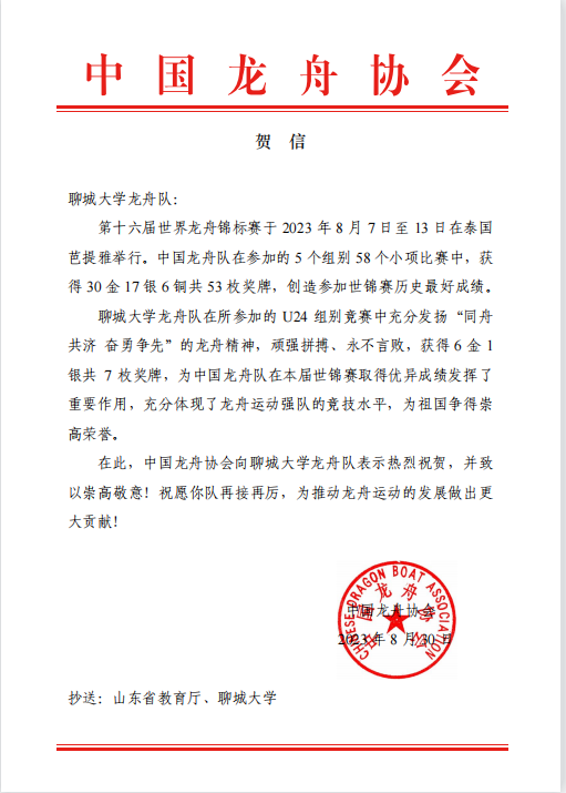 我校龙舟队在第16届世界龙舟锦标赛获得佳绩,山东省政府、山东省教育厅及山东省龙舟协会相继给我校龙舟队发来贺信表示祝贺。8月30日,我校又接到中国龙舟协会致yl6776永利集团官网龙舟队贺信,祝贺yl6776永利集团官网龙舟队在第十六届世界龙舟锦标赛中充分发扬“同舟共济 奋勇争先”的龙舟精神,在7个比赛项目中获得6金1银的成绩,为中国龙舟队在本届世锦赛取得优异成绩发挥了重要作用。为祖国争得崇高荣誉。