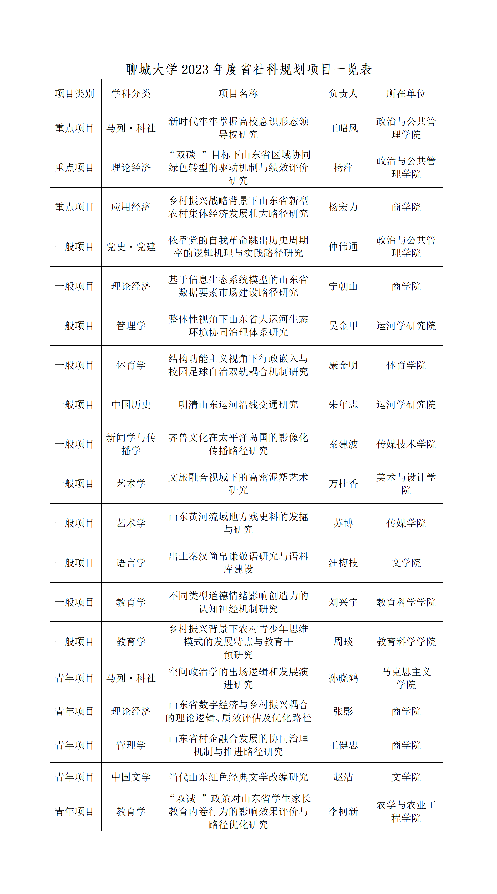 近日,山东省哲学社会科学工作办公室正式公布了2023年度山东省社科规划研究项目立项名单。yl6776永利集团官网获批立项19项,其中:重点项目3项、一般项目11项、青年项目5项,立项率为37%,立项总数位列省属高校第七位,重点项目立项数位列省属高校第四位。
