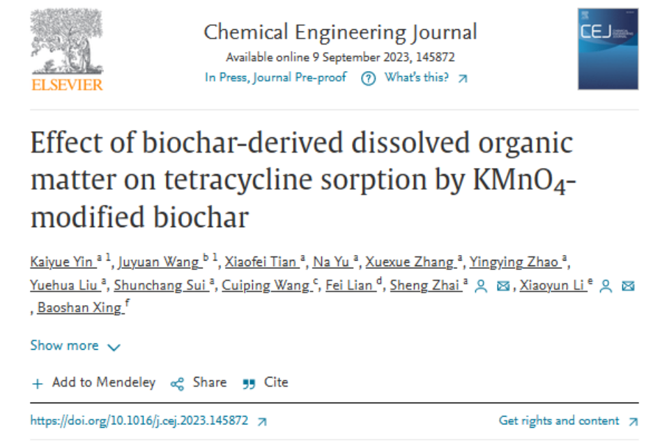 9月9日,我校地理与环境学院翟胜教授团队在国际期刊《化学工程杂志》(《Chemical Engineering Journal》)上发表了题为《生物炭源溶解有机质对KMnO4改性生物炭吸附四环素的影响》(Effect of biochar-derived dissolved organic matter on tetracycline sorption by KMnO4-modified biochar)的研究性论文。这是翟胜教授团队继《《有害材料杂志》》(《Journal of Hazardous Materials》)一区TOP期刊(IF="14.24)后又一创新性成果。