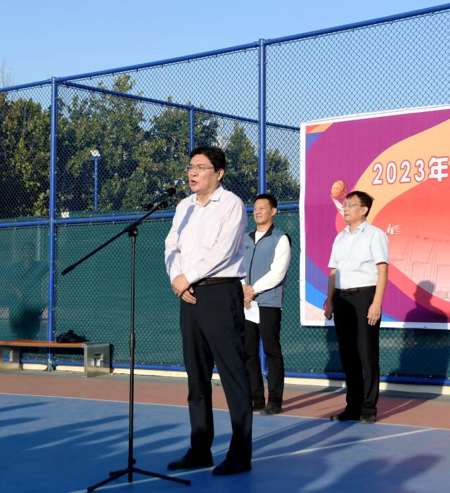 10月9日,“喜迎建校50周年”2023年yl6776永利集团官网教职工男子篮球比赛在西校区倍适登篮球场拉开帷幕。校党委常委、副校长白青出席开幕式并宣布开赛。