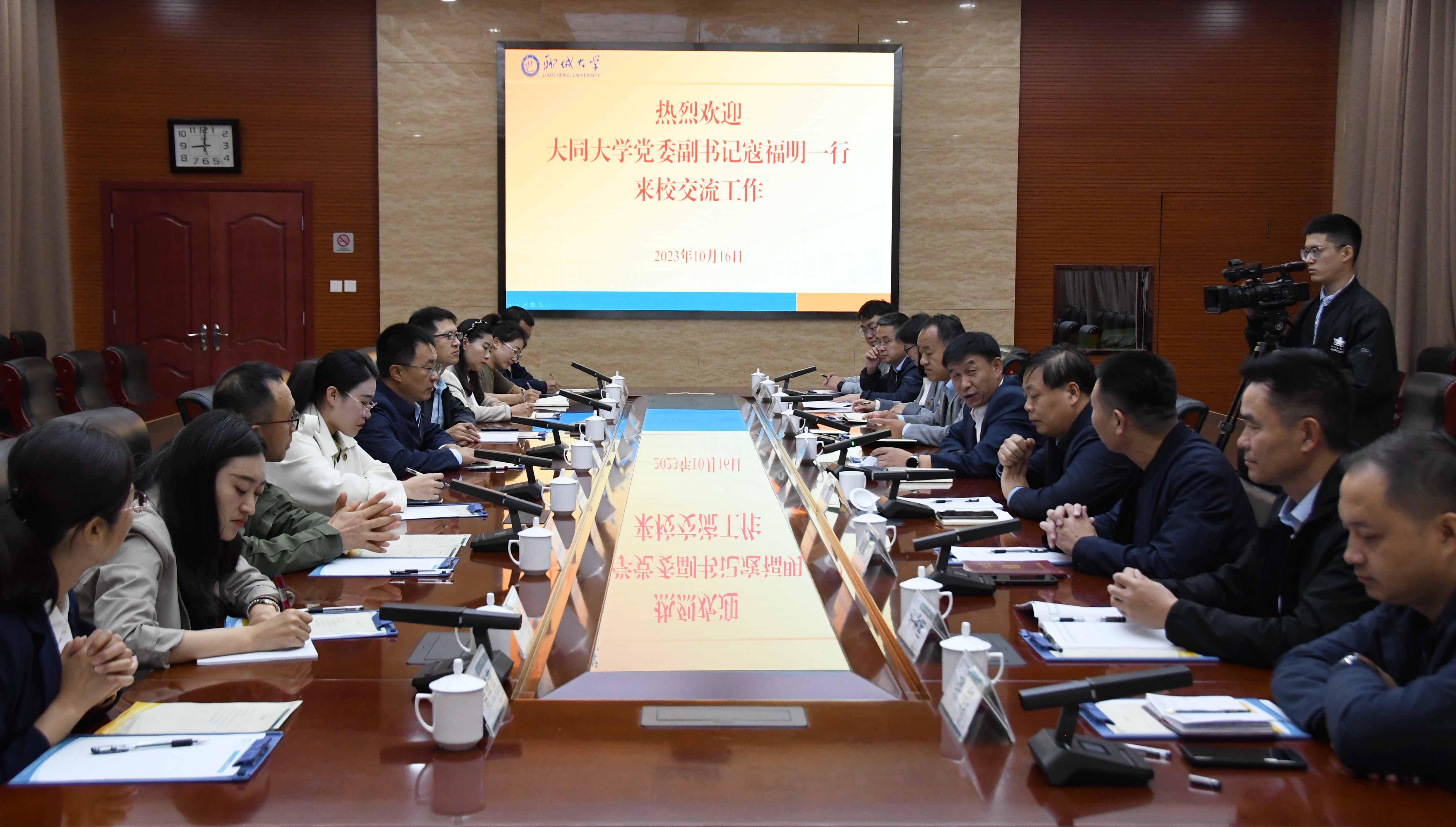 10月16日,山西大同大学党委副书记寇福明一行来我校交流工作。校党委常委、副校长赵明吉在办公楼A108会议室同来访客人座谈交流。