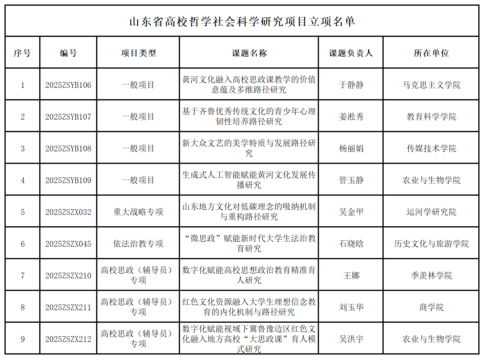 近日,山东省教育厅发布山东省高等学校哲学社会科学研究项目立项名单,我校获批9项,立项率70%。其中,农业与生物学院获批2项,马克思主义学院、教育科学学院、传媒技术学院、运河学研究院、历史文化与旅游学院、季羡林学院、商学院各获批1项。