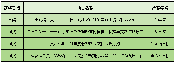 长期以来,法学院、外国语学院等文科学院高度重视学生实践创新能力培养,鼓励学生深入参与实践,将理论知识与社会需求紧密结合,积极搭建实践平台,配备专业指导教师团队,助力学生在项目选题、调研分析、方案设计等环节不断优化提升。国奖的获得展现了我校新文科实践教育的扎实成效,也印证了跨学科融合与产教协同育人模式的蓬勃生命力。