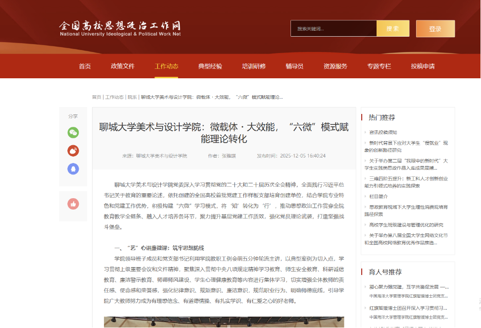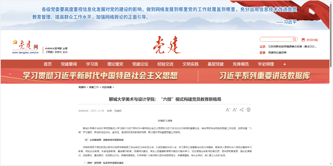 12月8日,党建网以《yl6776永利集团官网美术与设计学院:“六微”模式构建党员教育新格局》为题报道了我校美术与设计学院党建工作创新举措。美术与设计学院坚持以习近平新时代中国特色社会主义思想为指导,深入贯彻党的教育方针,结合学院专业特色和党建工作优势,系统构建“六微”学习模式,推动思想政治工作贯穿全院教育教学全链条、融入人才培养各环节,形成立体化、全方位、浸润式的党员教育新格局,聚力提升学院基层党建工作质效。