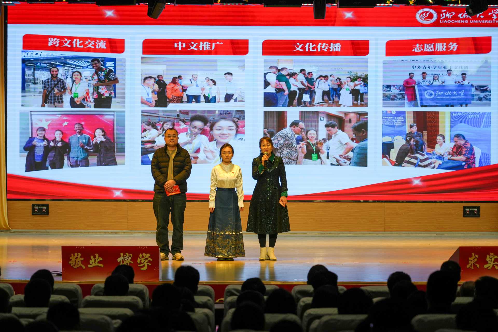 国家奖学金获得者潘星如讲述了自己深入西藏调研、远赴萨摩亚支教的经历;十大优秀学生王士宇分享了他带领团队荣获全国大学生新文科实践创新大赛金奖等多项奖项的奋斗历程。颁奖环节中,学生代表还通过歌曲、舞蹈等形式,展现青春风采,激励学子坚守初心、勇担使命。