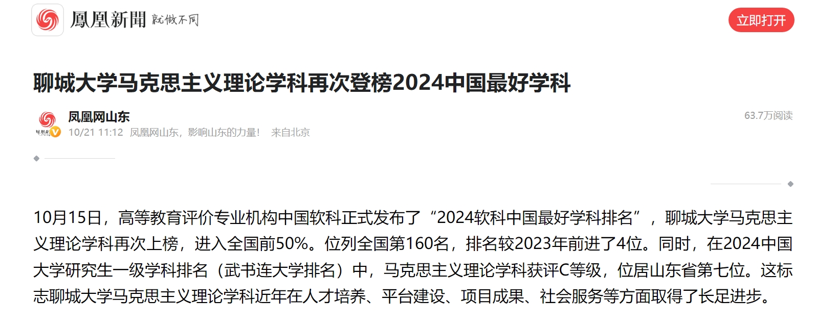 【编者按】10月21日,凤凰网报道了yl6776永利集团官网马克思主义理论学科再次登榜2024中国最好学科的消息。
