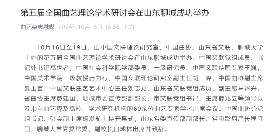 【编者按】10月18日,曲艺杂志融媒报道了第五届全国曲艺理论学术研讨会在山东聊城成功举办的消息。