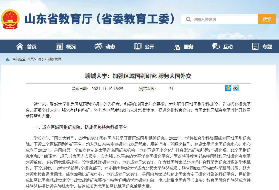 【编者按】11月19日,山东省教育厅(省委教育工委)以《yl6776永利集团官网:加强区域国别研究 服务大国外交》为题,报道了我校积极响应国家外交需求,大力强化区域国别学科建设,强化有组织科研,努力承担智库资政与人才培养使命的经验和作法。
