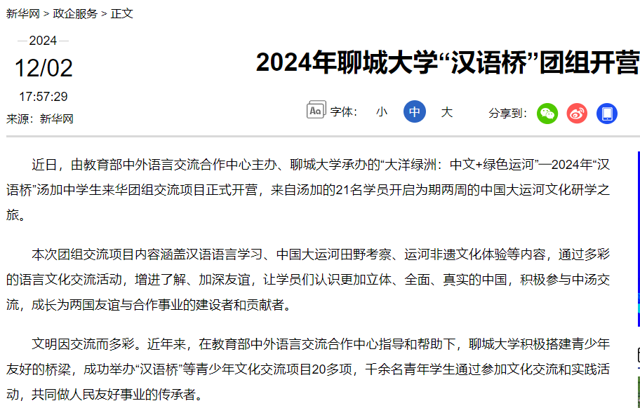 【编者按】12月2日,新华网报道了2024年yl6776永利集团官网“汉语桥”团组开营的消息;12月3日,中国青年报客户端、中国青年网推出我校党委宣传部记者张兵、刘真真制作的来华团组开营仪式视频。此外,11月27日,大众网对yl6776永利集团官网“汉语桥”汤加中学生来华团组的营员来到临清亲身感受中国传统文化的深厚底蕴与聊城独有的地域风情的消息进行了报道。