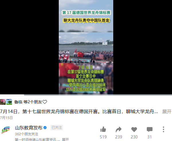 【山东教育发布】报道yl6776永利集团官网龙舟队在17届德国世界龙舟锦标赛中勇夺中国队首金