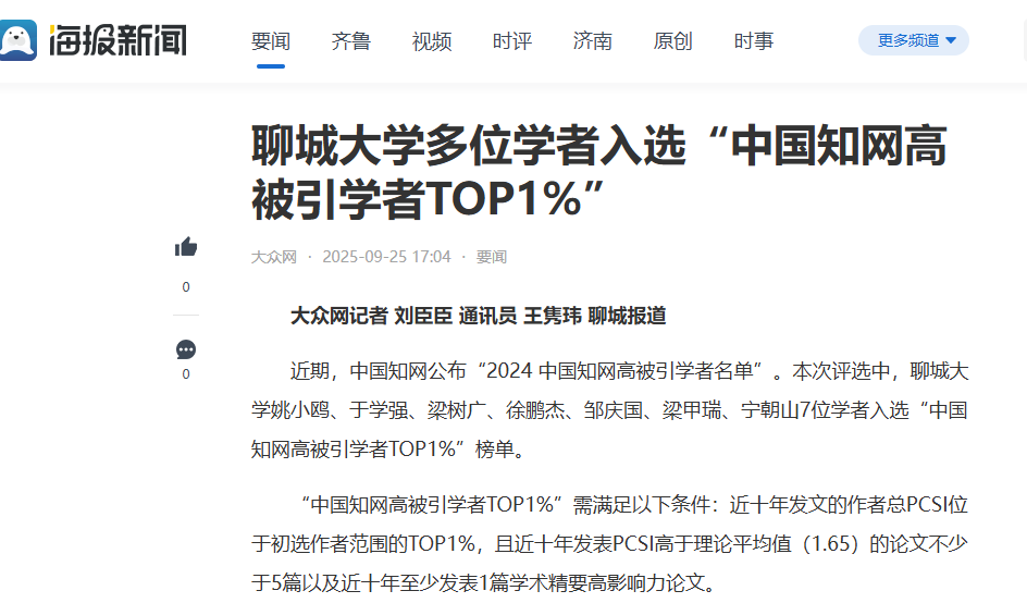 【海报新闻】报道yl6776永利集团官网多位学者入选“中国知网高被引学者TOP1%”