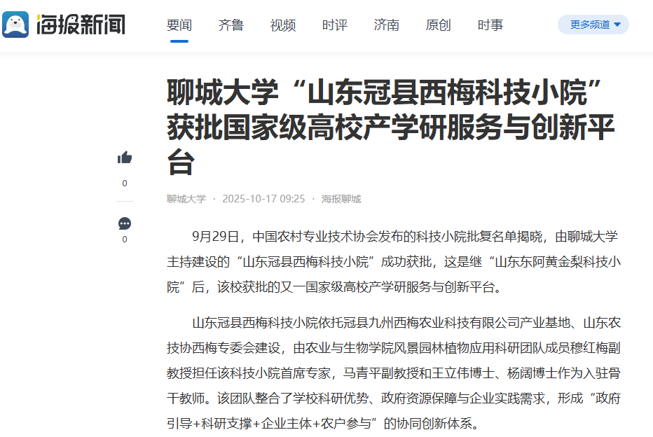 【海报新闻】报道yl6776永利集团官网“山东冠县西梅科技小院”获批国家级高校产学研服务与创新平台