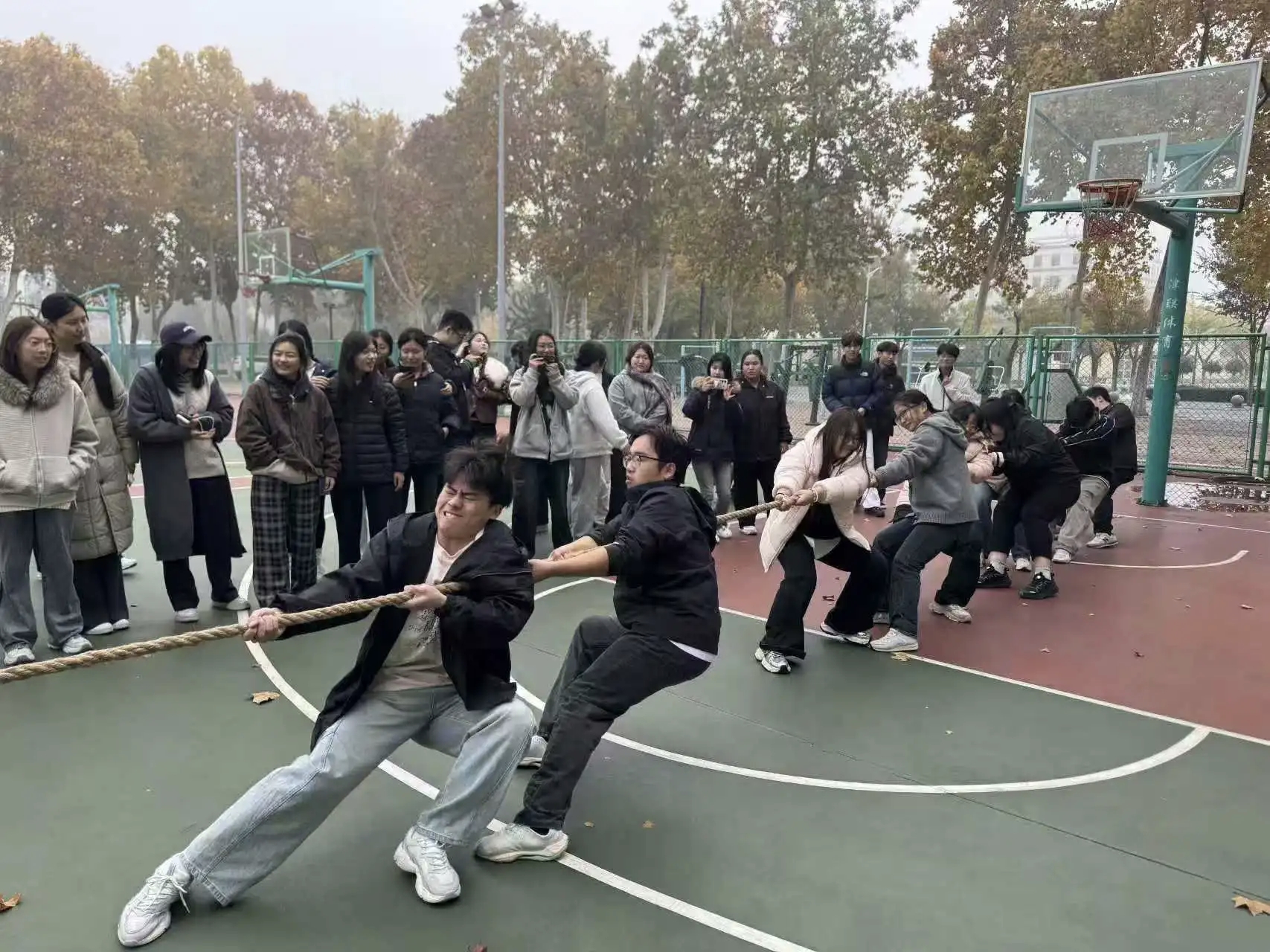 为了丰富同学们的校园文化生活,活跃校园气氛,增进学院之间的情谊交流,提高大学生参加阳光体育活动的积极性,促进学生间的交流,同时也为全面贯彻教育方针。美术与设计学院在11月1日上午于西校北篮球场举办了以“‘绳’彩飞扬 力聚一心”为主题的拔河比赛。